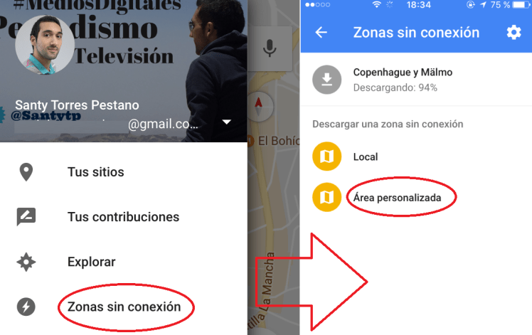 A continuación se te abrirá un nuevo panel de opciones -en la foto de abajo a la izquierda-, donde deberás seleccionar la opción ‘Zonas sin conexión’. Seguidamente, en la nueva pantalla -derecha- pulsa sobre ‘Área personalizada’.