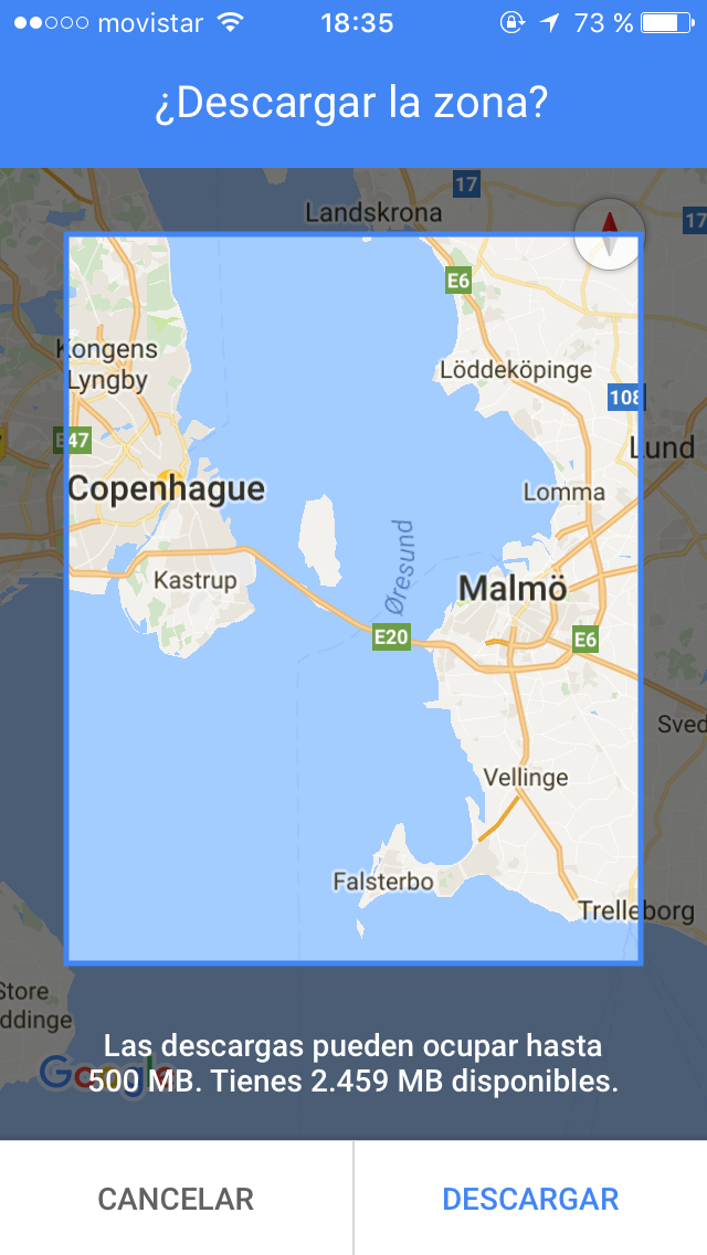Tras el anterior paso, se te abrirá una pantalla con un mapa -como el que ves abajo-. Lo único que tienes que hacer ahora es mover el cuadrado -que representa la zona que vas a descargar- hacia el lugar donde vas a viajar. Por ejemplo, en este caso hemos desplazado el mapa hacia Copenhague y, como también estaba previsto hacer una pequeña escapada a Malmö -Suecia- hemos alejado el mapa un poco para descargar también esta ciudad y sus alrededores.