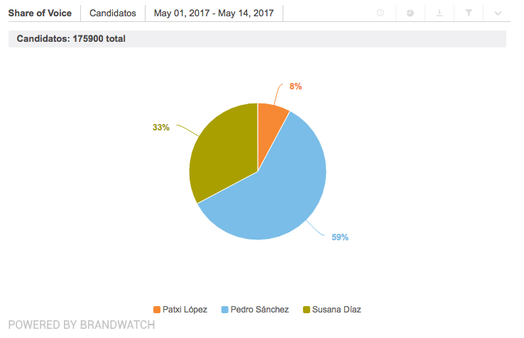 Sin embargo, Pedro Sánchez el candidato más mencionado en las redes sociales, según Brandwatch. Con un total de 98.000 menciones en el período de estudio -del 1 al 14 de mayo- frente a las 53.000 de Díaz y las 13.000 de López. De esta manera, las RRSS parecen confirmar lo que ya se percibía de antemano, que el debate se reñirá especialmente entre la actual presidenta de la Junta de Andalucía y Pedro Sánchez.