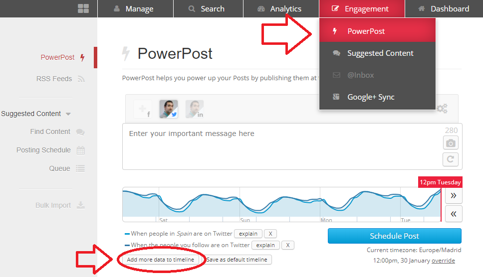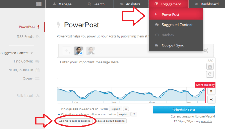 Existen varias herramientas que te permiten conocer cuál es la mejor hora para publicar, aunque ManageFlitter es, sin duda, una de las más sencillas y prácticas. Accede a esta web e inicia sesión con tus datos de Twitter. A continuación, selecciona la opción ‘Engagement’ y ‘PowerPost’.